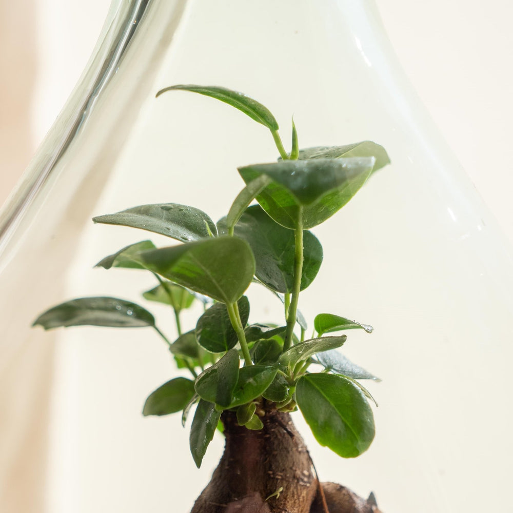 Une bocal en verre de 18,5cm de diamètre sur 30cm de hauteur, un Ficus microcarpa et une jolie décoration unique avec de la mousse naturelle et petits cailloux.