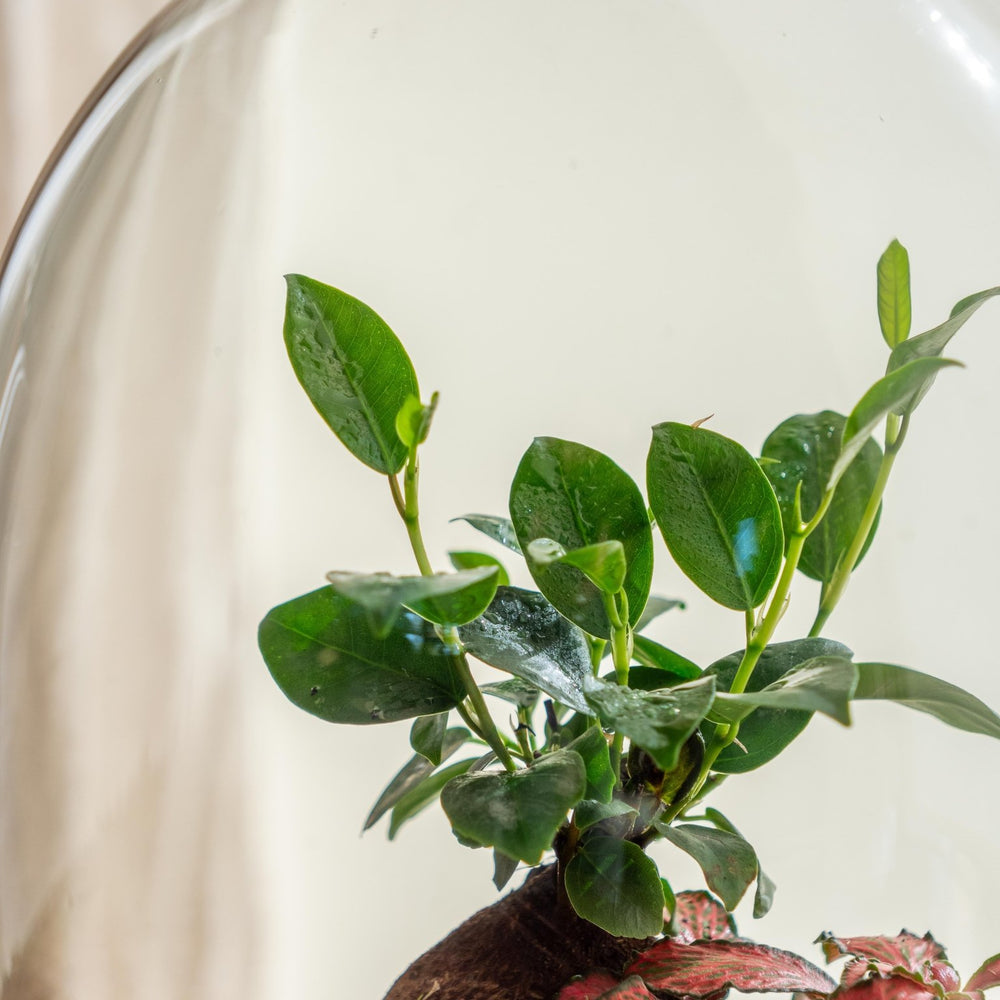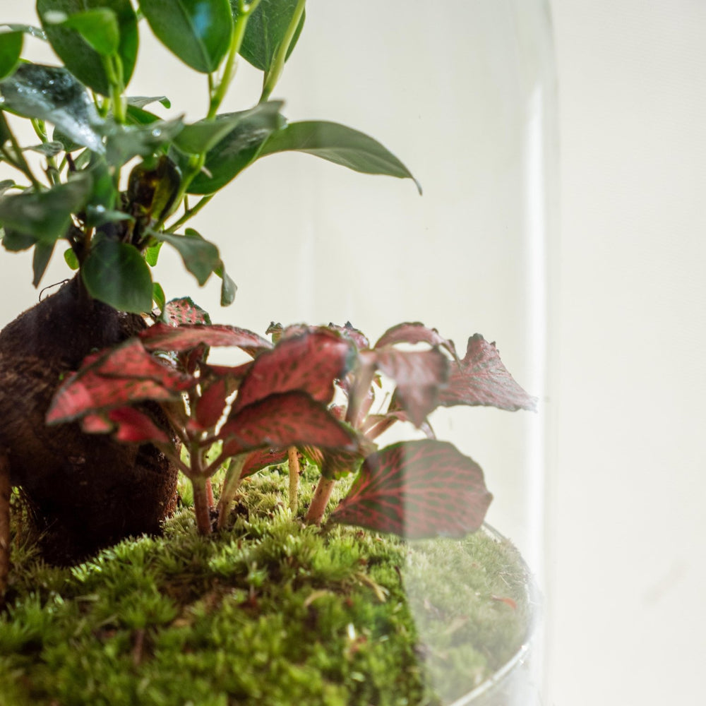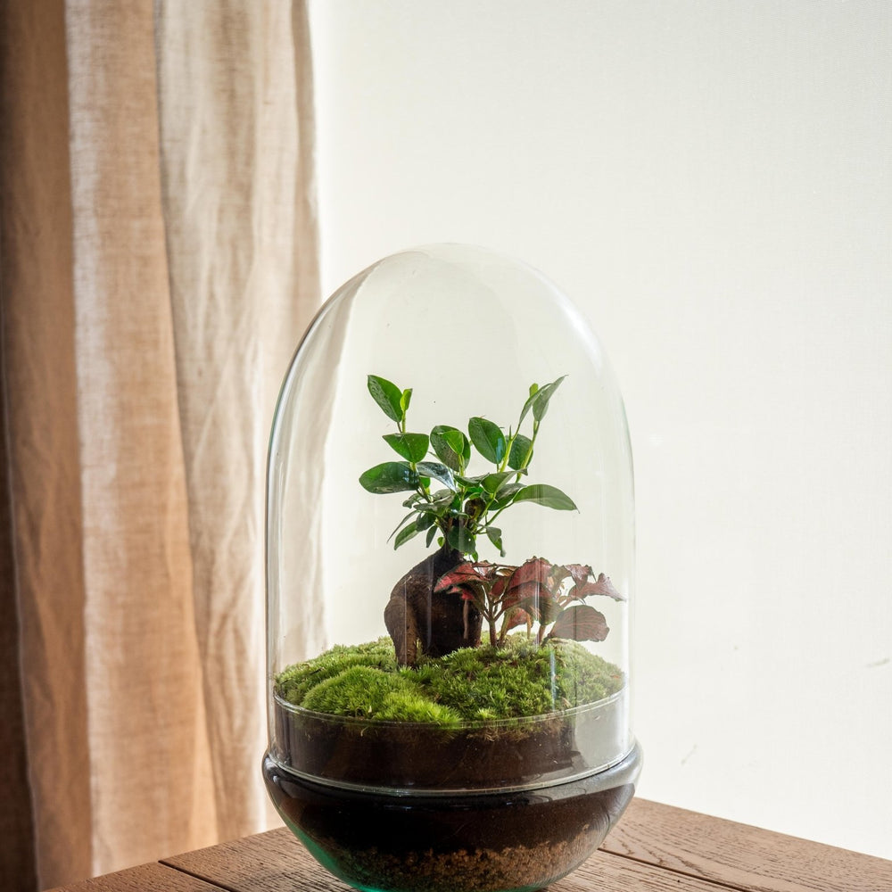 Naturel, créatif, autonome, le terrarium est l'élément végétal et décoratif du moment. Nous mettons beaucoup de coeur dans nos réalisations, chaque terrarium est une composition unique, réalisée dans notre atelier parisien. Le terrarium Siquijor est idéal à disposer sur une table basse, une commode, ou un grand bureaUne cloche en verre recyclé de 30cm sur 18cm de diamètre, une corde naturelle, un Ficus microcarpa, un mini Fittonia rouge et une jolie décoration unique avec de la mousse naturelle et petits cailloux.