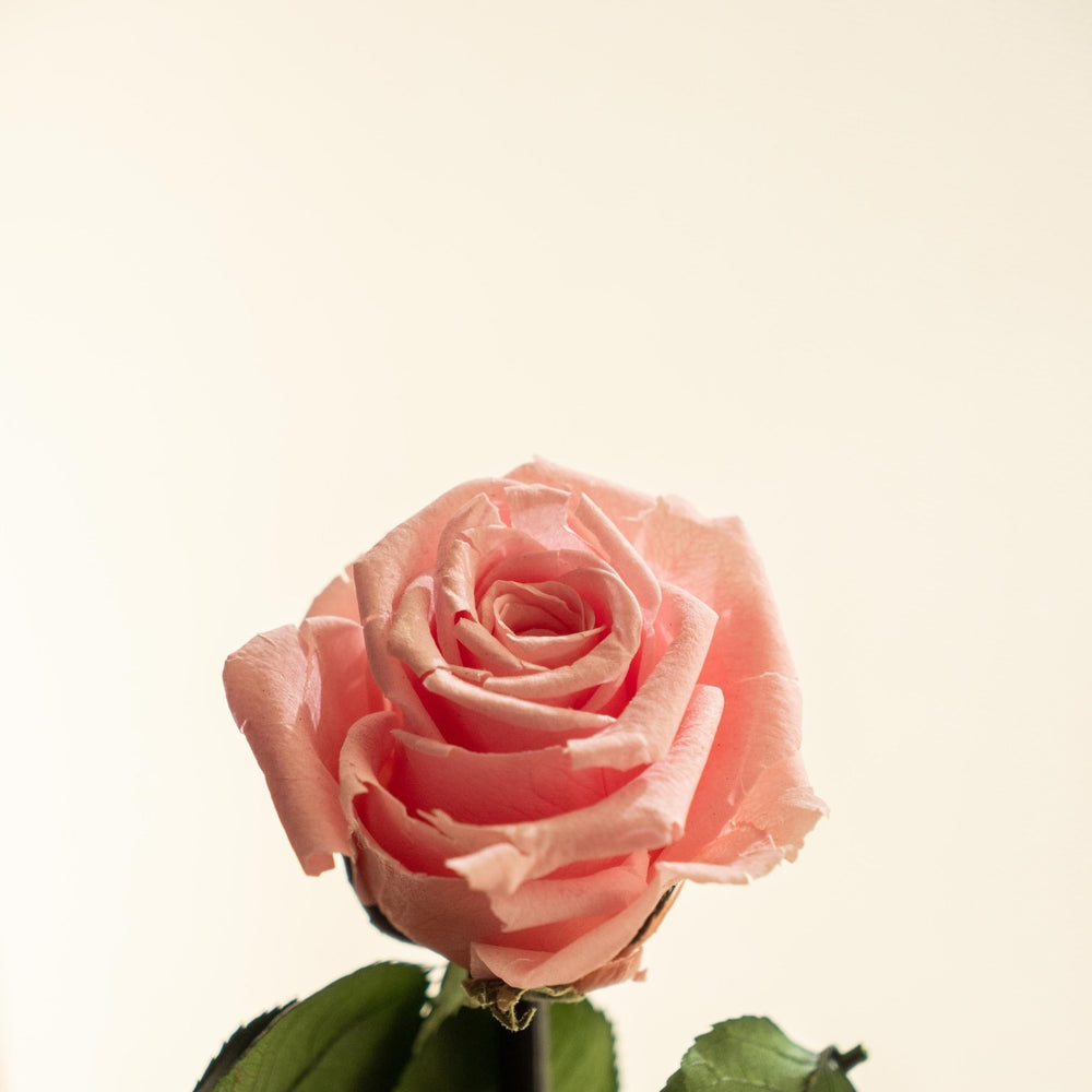 La rose et la mousse ont subi un processus au cours duquel la sauge et l'eau sont remplacées par un liquide de conservation biodégradable à base de plantes.