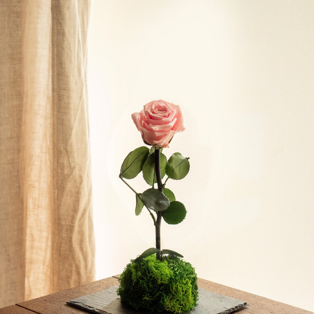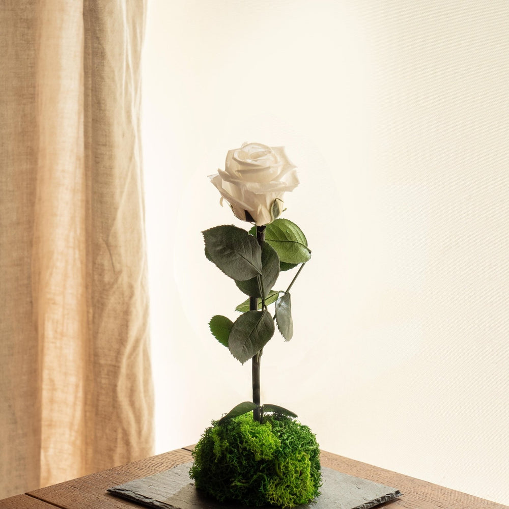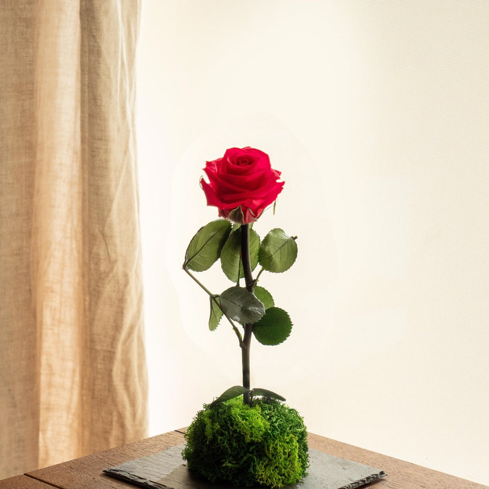 Découvrez notre nouveau kokedama entièrement stabilisé pour offrir une rose éternelle à votre moitié.