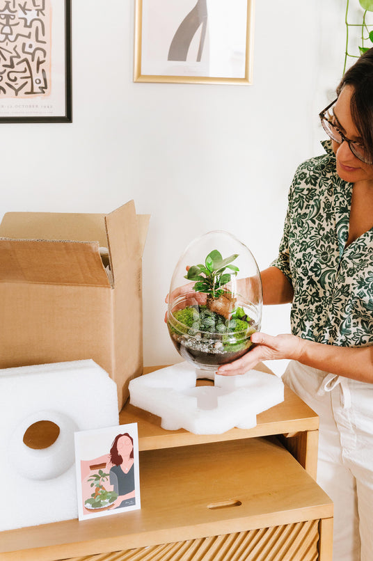 Nous assurons un emballage soigné des terrariums pour préserver la composition créée par nos experts et éviter tout mouvement pendant le transport, garantissant ainsi une qualité optimale.